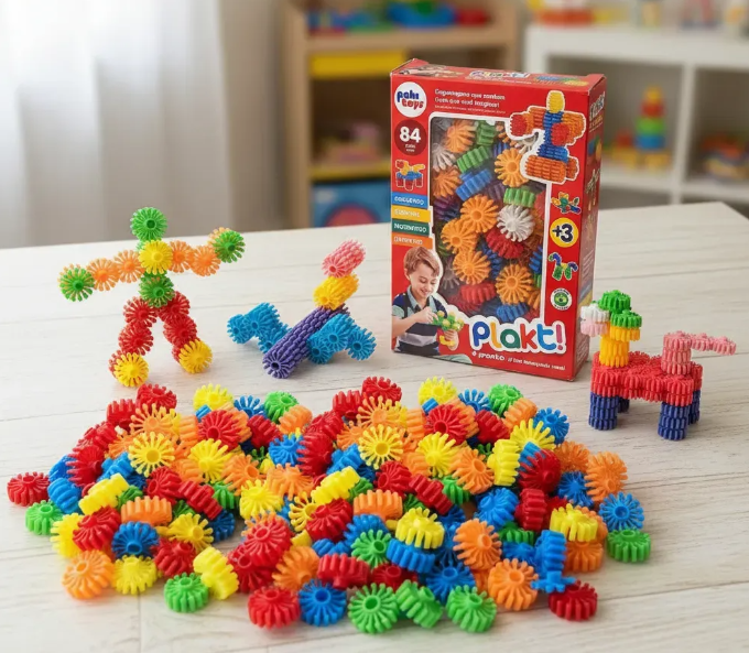 Criar, montar e imaginar. O Plakt é um brinquedo de montagem com engrenagens coloridas que se encaixam facilmente, permitindo que as crianças costruam diferentes formas e objetos enquanto desenvolvem a criatividade, a coordenação motora e o racíocinio.