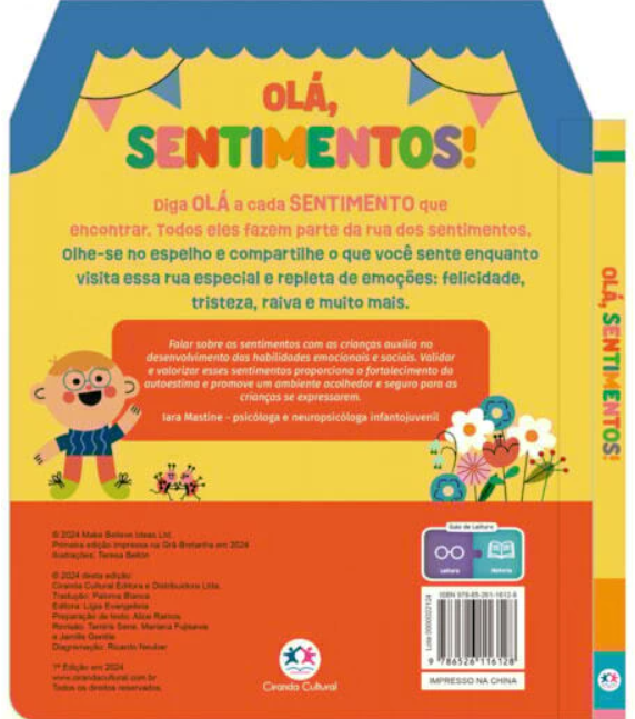 Um livro com espelho para os pequenos aprenderem sobre os sentimentos. Diga OLÁ a cada SENTIMENTO que encontrar. Todos eles fazem parte da rua dos sentimentos. Olhe-se no espelho e compartilhe o que você sente enquanto visita essa rua especial e repleta de emoções: felicidade, tristeza, raiva e muito mais.
