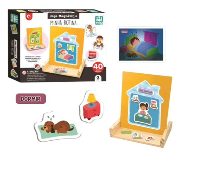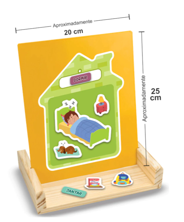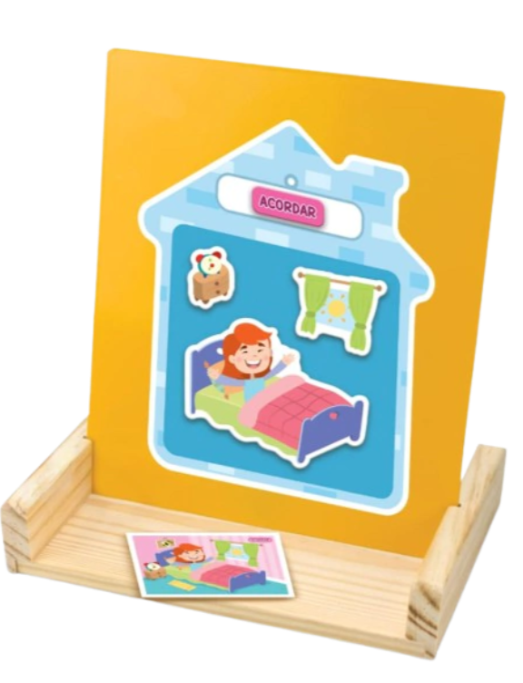 Criar uma rotina ajuda a criança e entender o que vem antes e depois em seu dia-a-dia, aumenta sua confiança e desenvolve a autonomia. Com esse cuadro a criança vai fazer uma linha do tempo com as cartinhas de atividades (acordar, escovar os dentes, tomar café …). A partir daí, ela vai repetir a cena no painel de metal, colocando as peças de imã de acordo com cada atividade.