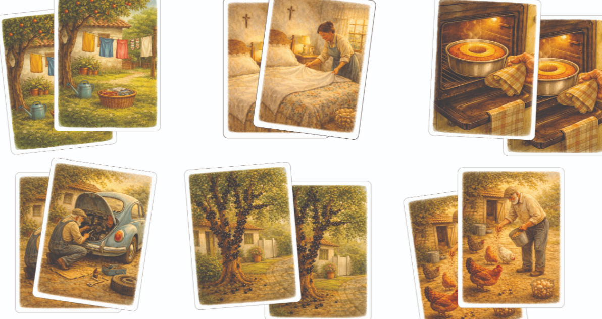 O conjunto é composto por 20 peças em madeira, com ilustrações cuidadosamente selecionadas que representam cenas, objetos e momentos marcantes do cotidiano, como preparar alimentos, ouvir rádio, cuidar da casa ou compartilhar um café. Cada imagem pode abrir espaço para lembranças, memórias pessoais e conexões emocionais, tornando o recurso especialmente significativo em contextos terapêuticos, familiares e institucionais.