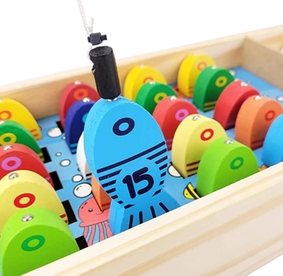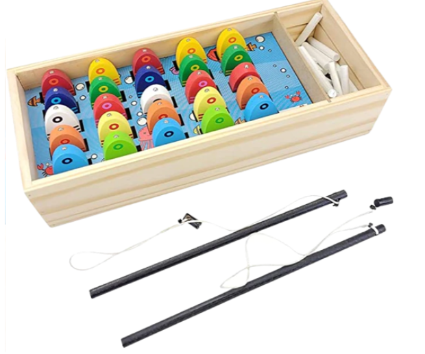 Contém: 25 Peixes, 40 Palitos, 02 Varas de pescar. Tudo de madeira.