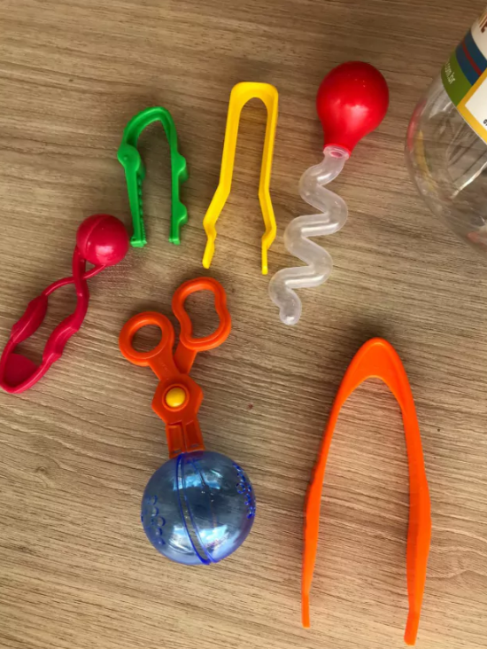 Um kit super completo para trabalhar a coordenação motora fina. Com sete recursos diferentes, são diversas as possibilidades de atividades para fazer e desenvolver os músculos das mãos e dedos, além das habilidades pré-tesoura e pré-escrita. Pegando pecinhas pequenas com as pinças ou tesouras, as crianças também desenvolver a coordenação entre mãos e olhos, bem como a atenção. Algumas sugestões de atividades com esses materiais são: transferência de materiais (peças pequenas, pedrinhas, pompons), atividades de separação de cores, atividades com água (principalmente com o conta gotas ou tesoura bola), entre tantas outras!